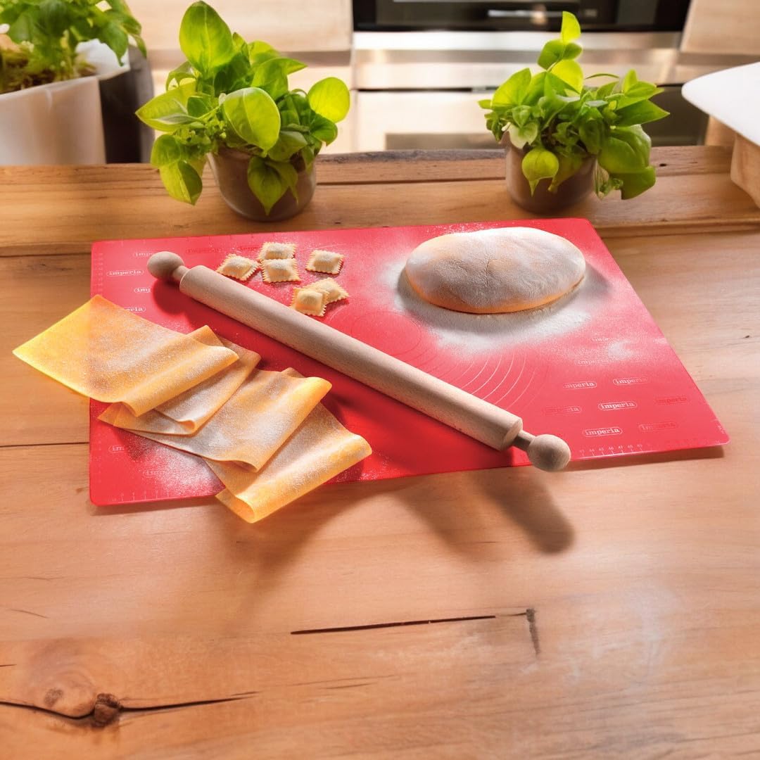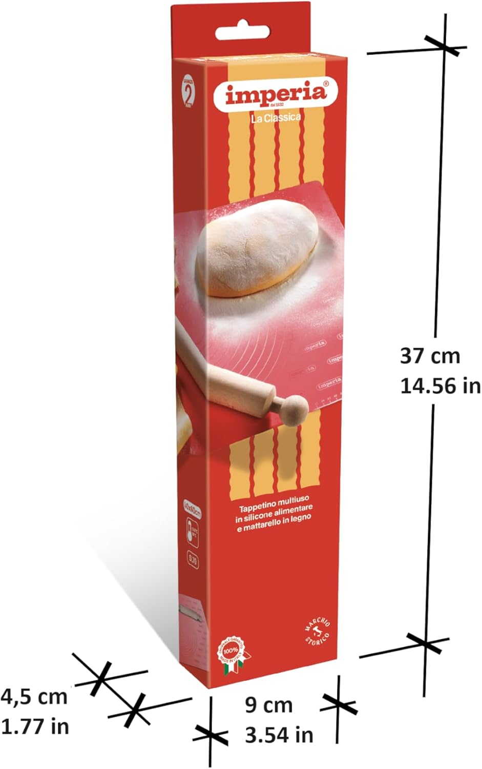 - UNIQUE DESIGN The silicone mat measures 60*40cm and comes with wooden rolling pin. The correct measurements are indicated on the surface. Create your own recipes in combination with the Imperia fresh pasta machine and machine accessories from the range Imperia!