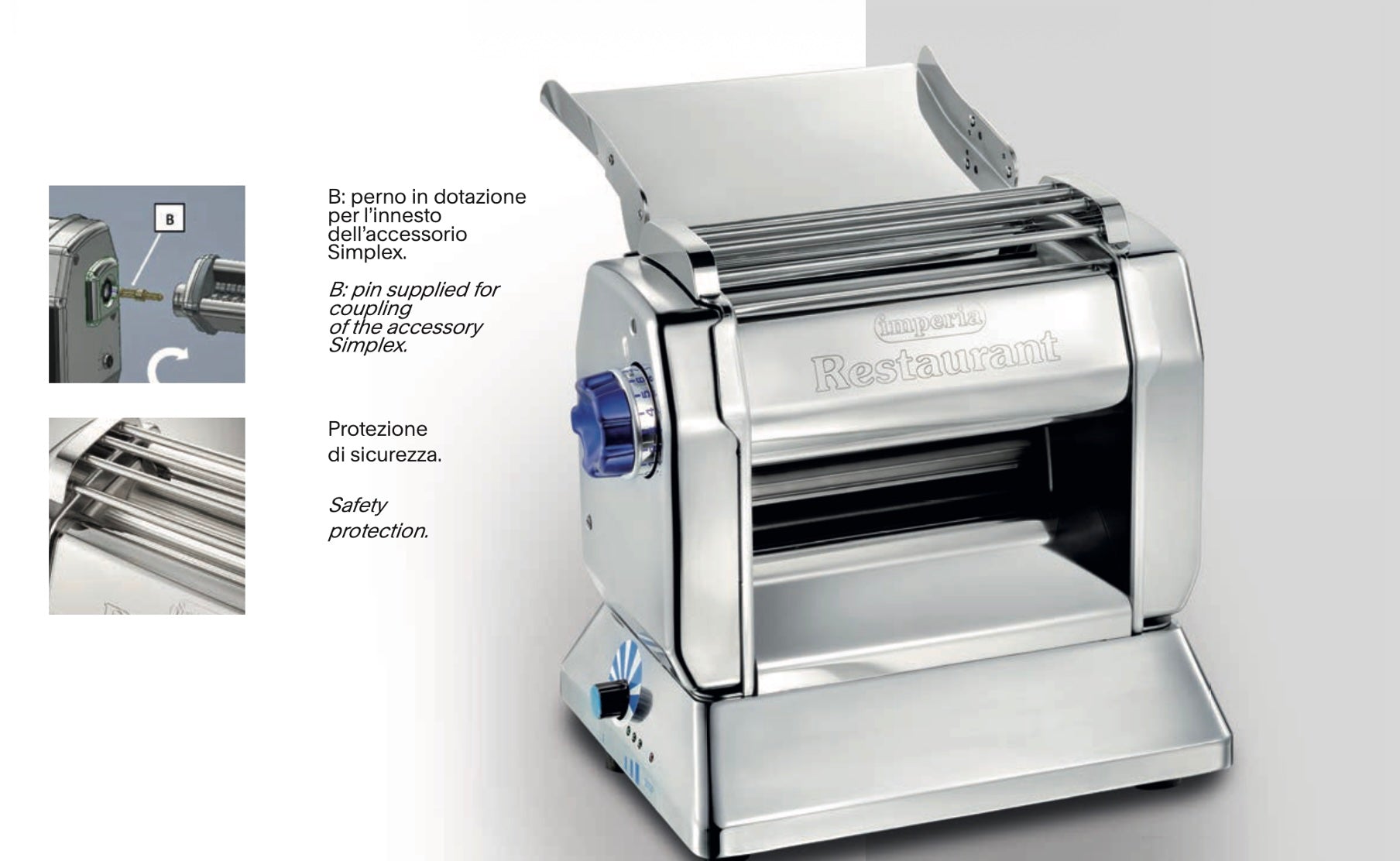 The Imperia Restaurant redefines the art of pasta making with its sophisticated and efficient design. This pasta machine, in a striking silver-grey, specializes in crafting perfect pasta sheets. Its precise thickness settings make it versatile for various pasta dishes, embodying the essence of Italian culinary tradition.